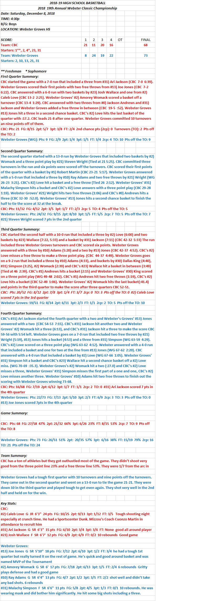 HSBB Boys 12/08/18 Webster Classic Championship: CBC 68 at Webster Groves 73 Final: Webster Groves gets a gritty win in own Tournament. Share this: Click to share on X (Opens in new window) X Click to share on Facebook (Opens in new window) Facebook Like Loading...