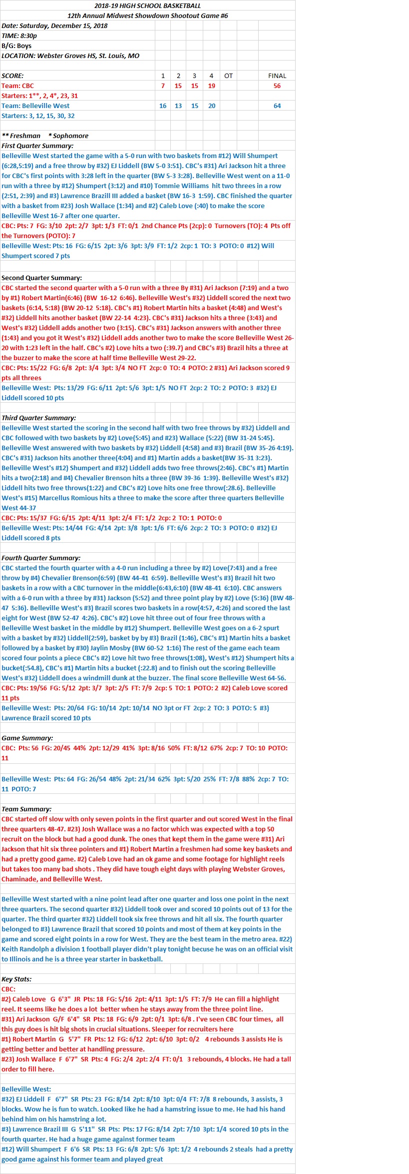 HSBB Boys 12/15/18 12th Annual Midwest Showdown Shootout at Webster Groves HS Game #6: CBC 56 vs Belleville West 64 Final Share this: Click to share on X (Opens in new window) X Click to share on Facebook (Opens in new window) Facebook Like Loading...