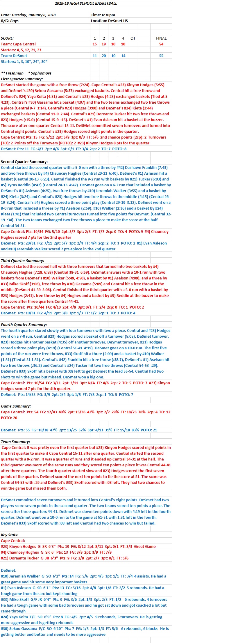 HSBB Boys 01/08/18 Cape Central 54 at Desmet 55 Final: #33)Mike Skoff hits the winner with :08 left Share this: Click to share on X (Opens in new window) X Click to share on Facebook (Opens in new window) Facebook Like Loading...
