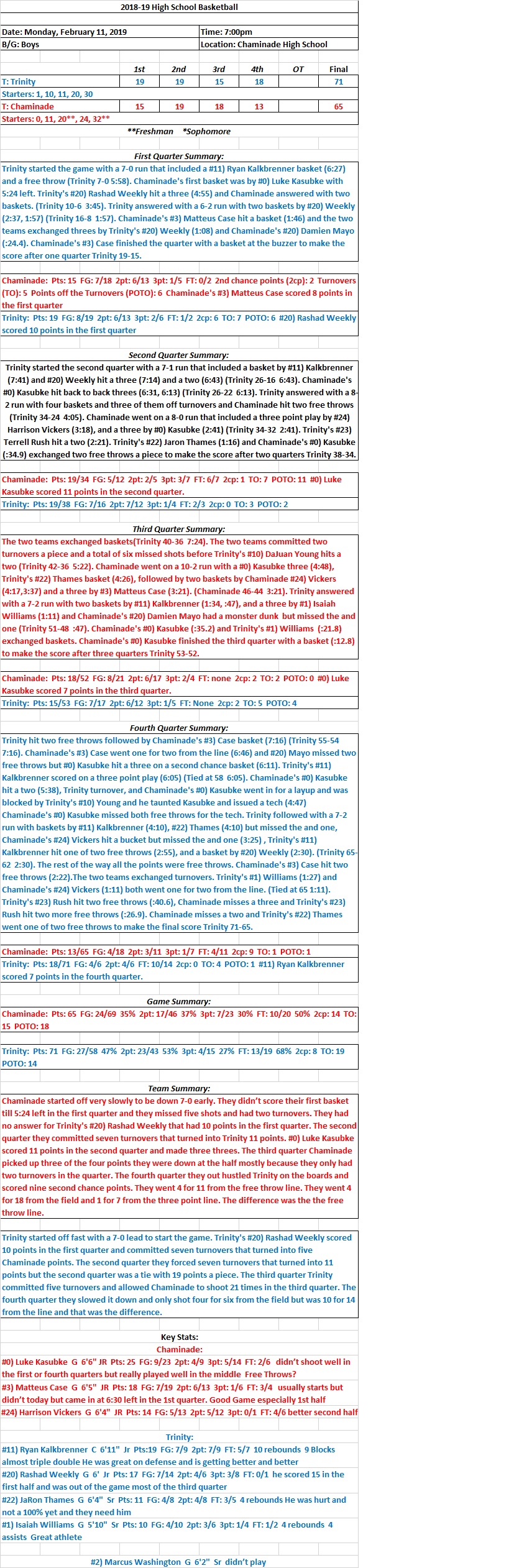 HSBB Boys 02/11/19 Trinity 71 at Chaminade 65 Final: Trinity is shorthanded but still won Share this: Click to share on X (Opens in new window) X Click to share on Facebook (Opens in new window) Facebook Like Loading...