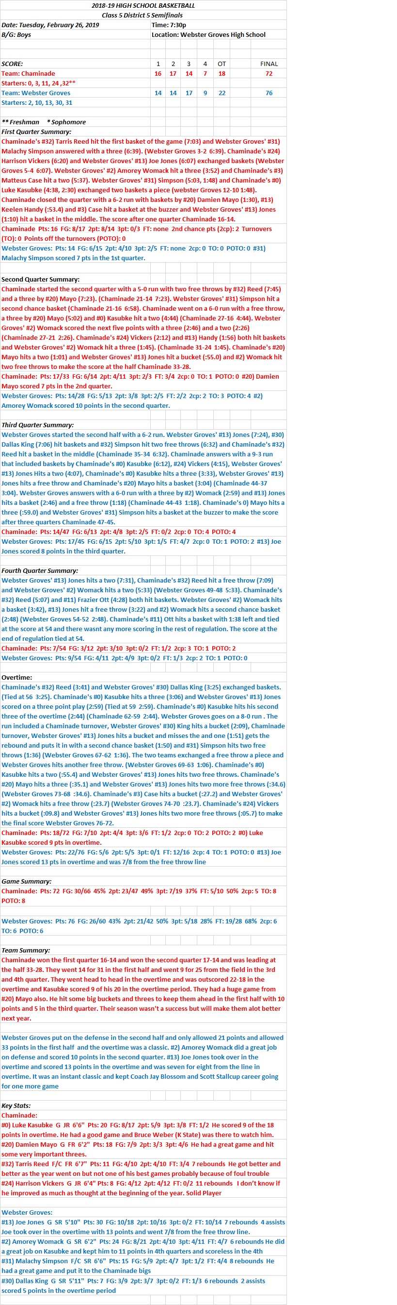 HSBB Boys 02/26/19 Class 5 District 5 Semifinals Chaminade 72 at Webster Groves 76 Final OT: Instant Classic Share this: Click to share on X (Opens in new window) X Click to share on Facebook (Opens in new window) Facebook Like Loading...
