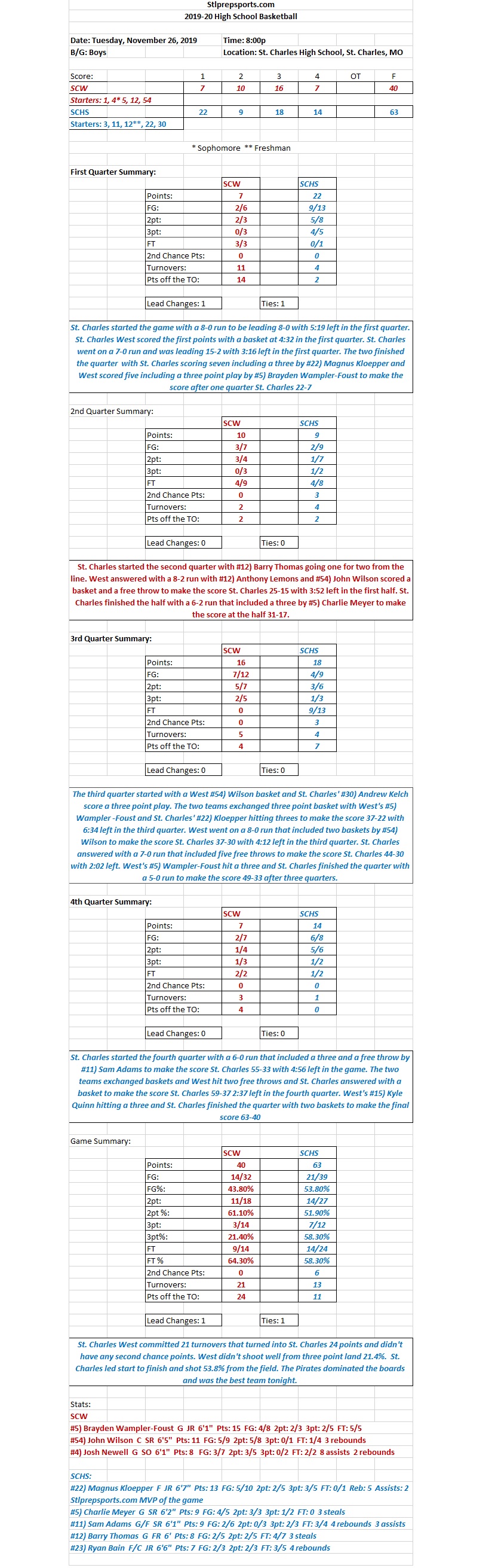 HSBB Boys 11/26/19 St. Charles West 40 at St. Charles 63 Final: St. Charles led start to finish to win the Annual Turkey Tip Off Share this: Click to share on X (Opens in new window) X Click to share on Facebook (Opens in new window) Facebook Like Loading...