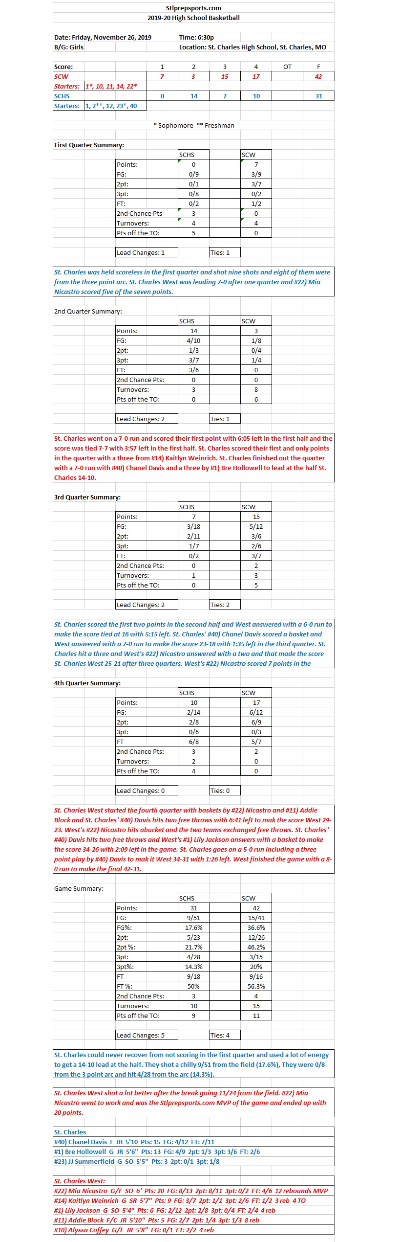 HSBB Girls 11/26/19 St. Charles West 42 at St. Charles 31: St. Charles West wins the Annual Turkey Tip Off game Share this: Click to share on X (Opens in new window) X Click to share on Facebook (Opens in new window) Facebook Like Loading...