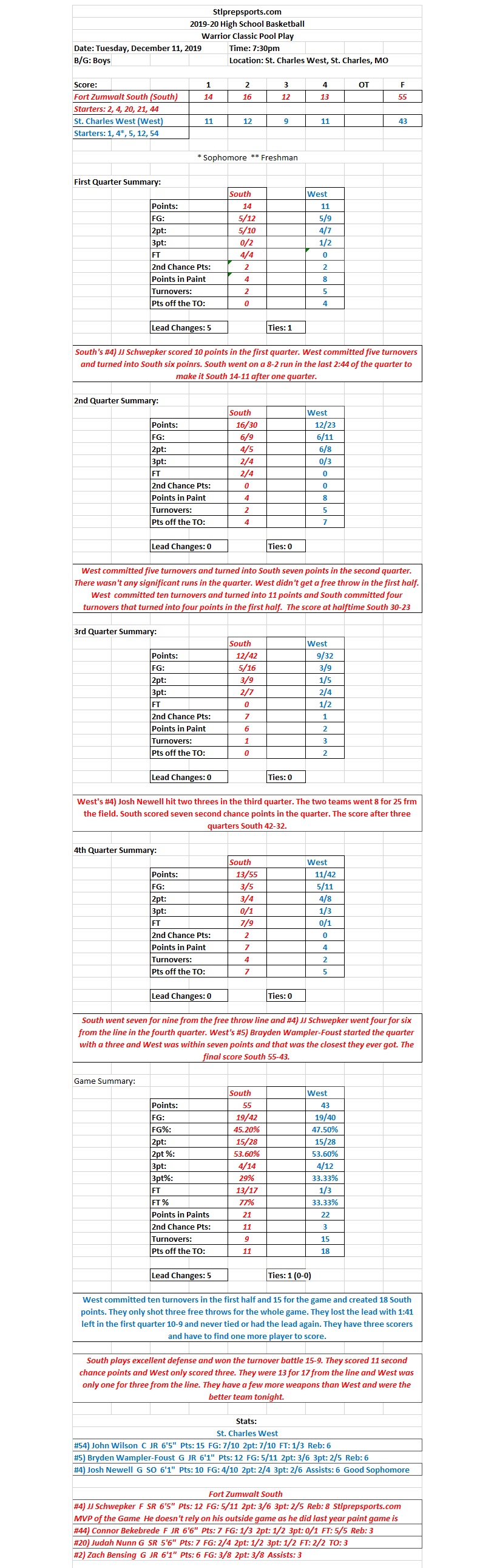 HSBB Boys Warrior Classic Pool Play Fort Zumwalt South 55 at St. Charles West 43 Final: South uses excellent Defense to get to Championship. Share this: Click to share on X (Opens in new window) X Click to share on Facebook (Opens in new window) Facebook Like Loading...