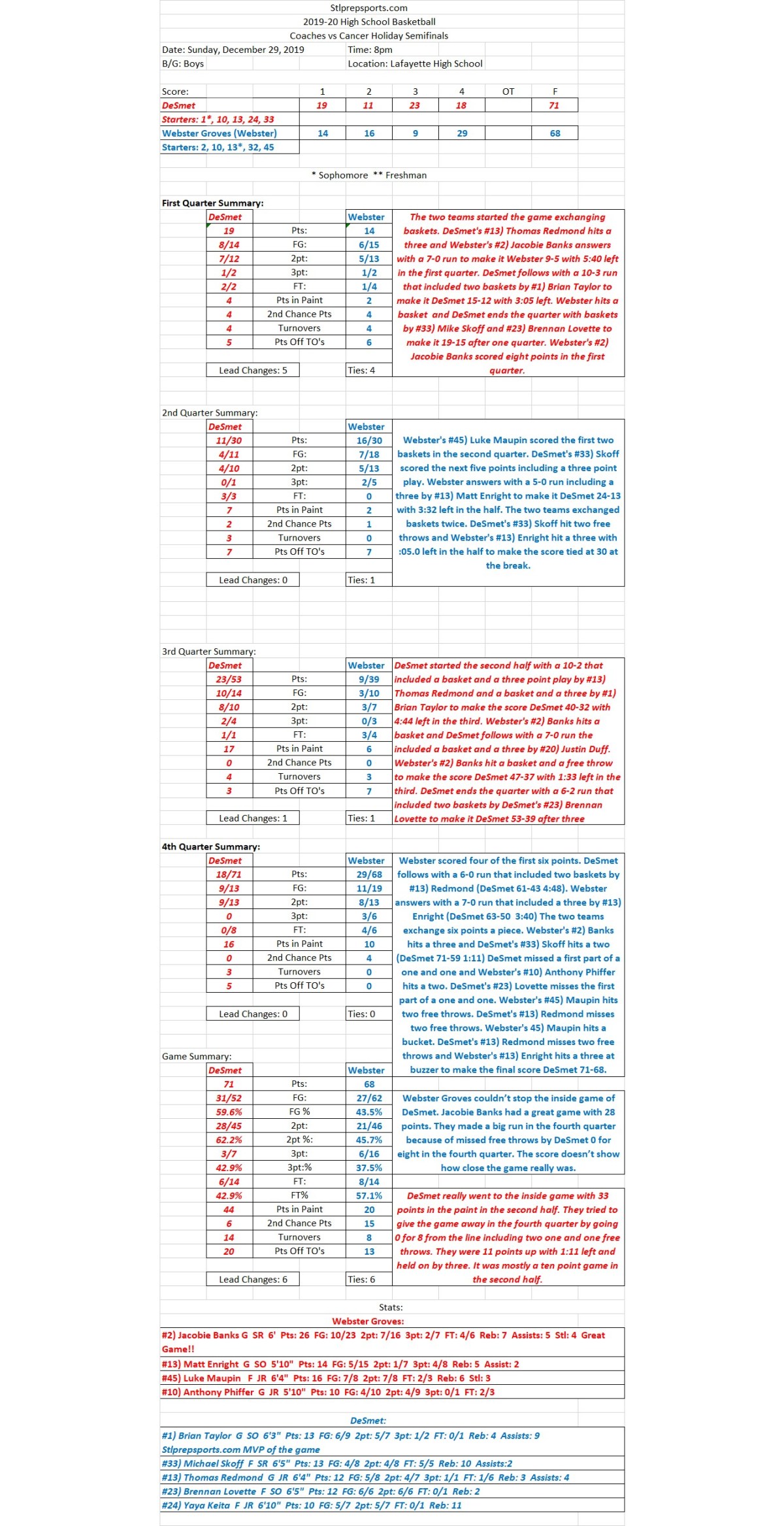 HSBB 12/29/19 Coaches vs Cancer Semifinals: DeSmet 71 Webster Groves 68 Final: DeSmet holds on to meet Mehlville in Championship Share this: Click to share on X (Opens in new window) X Click to share on Facebook (Opens in new window) Facebook Like Loading...
