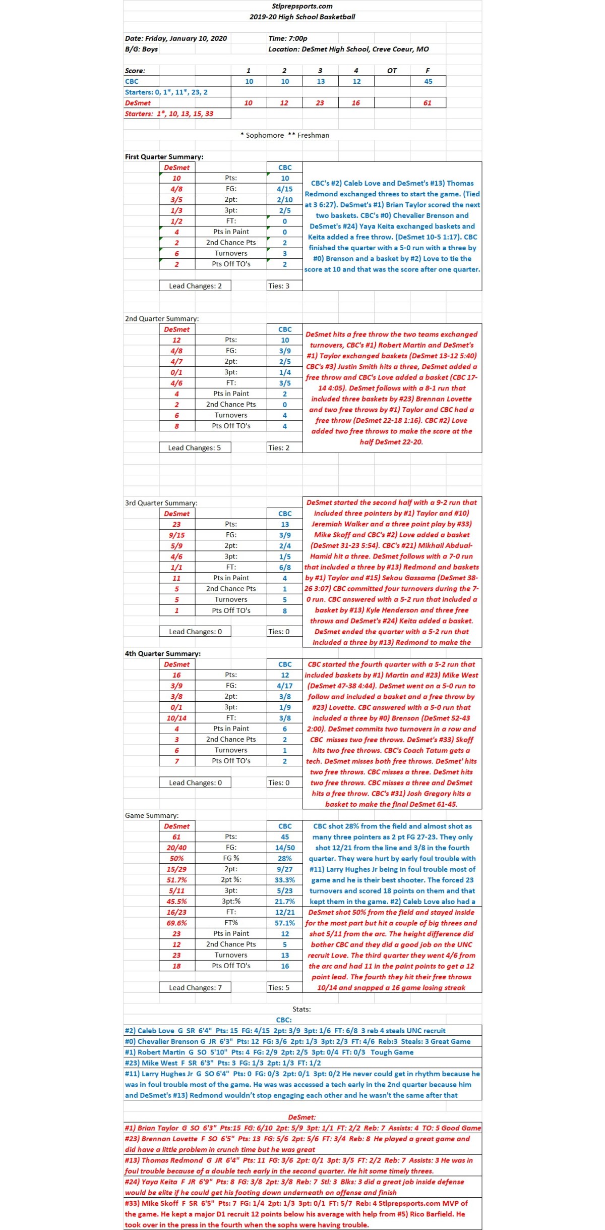 HSBB Boys 01/10/20 CBC 45 at DeSmet 61 Final: DeSmet controls the boards and wins the first big game of the MCC conference Share this: Click to share on X (Opens in new window) X Click to share on Facebook (Opens in new window) Facebook Like Loading...