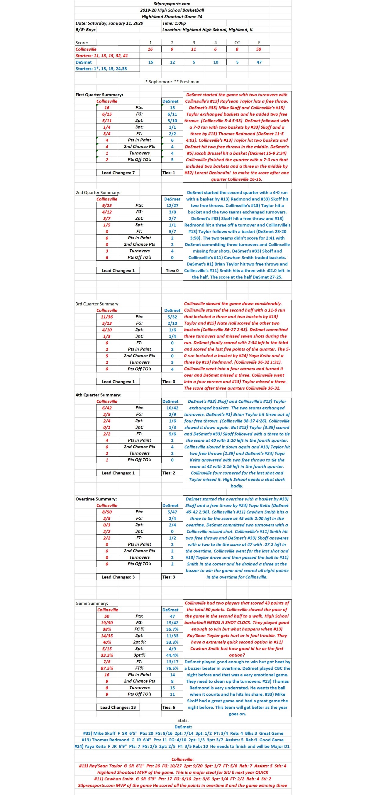 HSBB Boys Highland Shootout Game #4 DeSmet 47 vs Collinsville 50 OT Final: Collinsville’s #11)Cawhan Smith hits a three at the buzzer in overtime Share this: Click to share on X (Opens in new window) X Click to share on Facebook (Opens in new window) Facebook Like Loading...