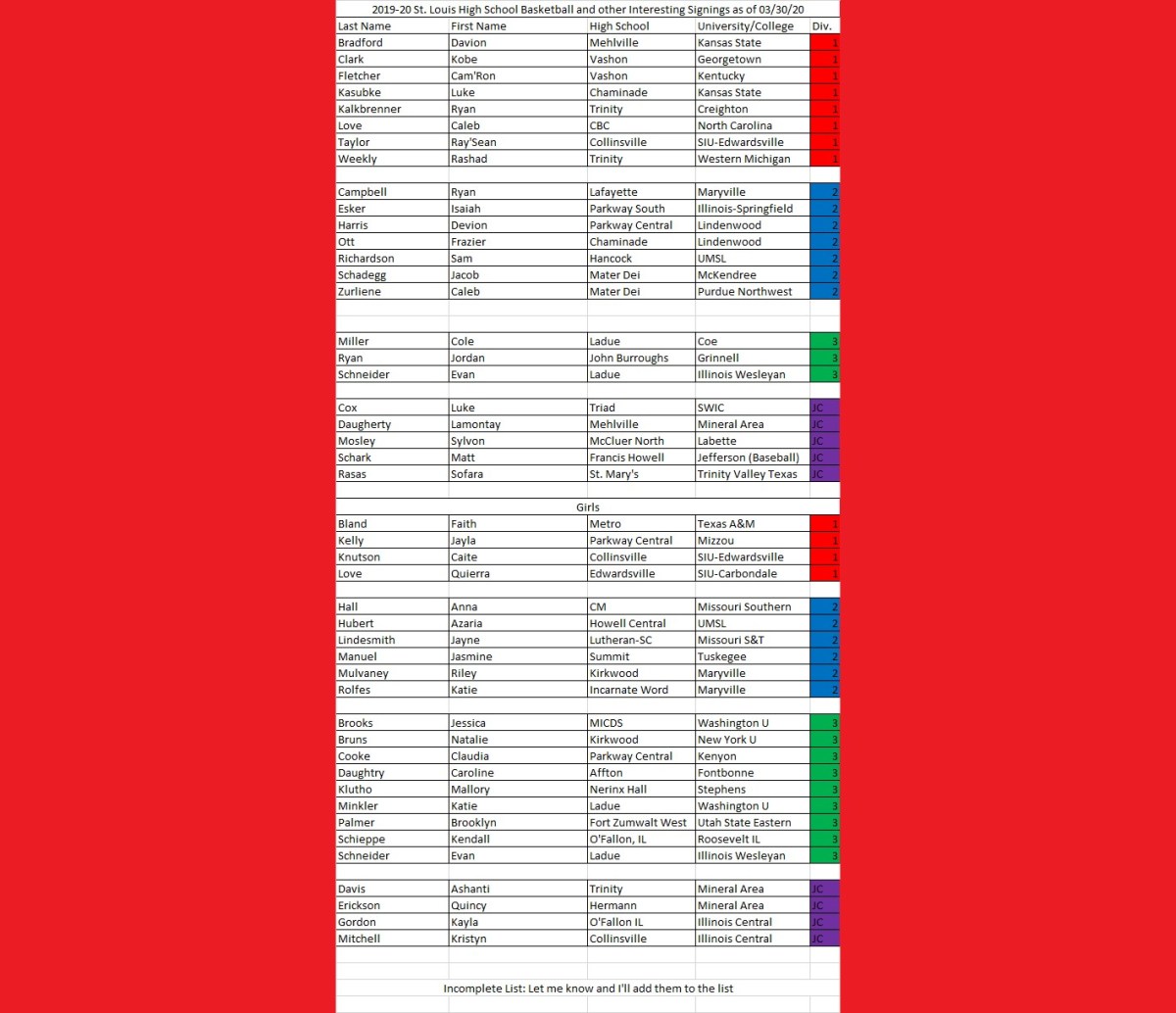 HSBB St. Louis Metro Basketball College Signings as of 3/30/2020 Share this: Click to share on X (Opens in new window) X Click to share on Facebook (Opens in new window) Facebook Like Loading...