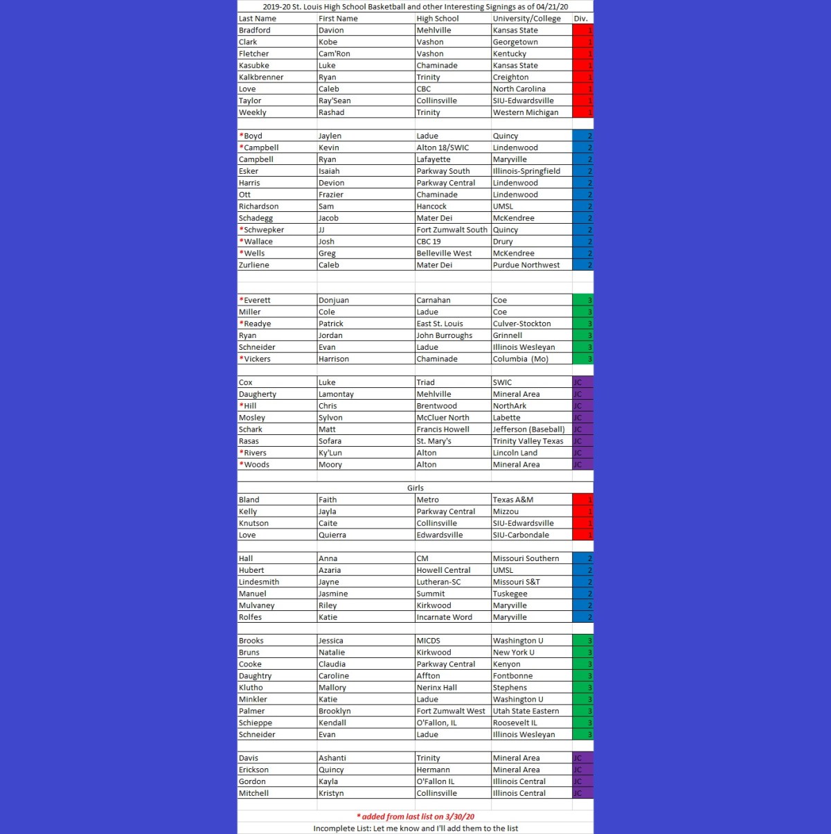 HSBB St. Louis Metro Basketball College Signings as of 04/21/2020 Share this: Click to share on X (Opens in new window) X Click to share on Facebook (Opens in new window) Facebook Like Loading...