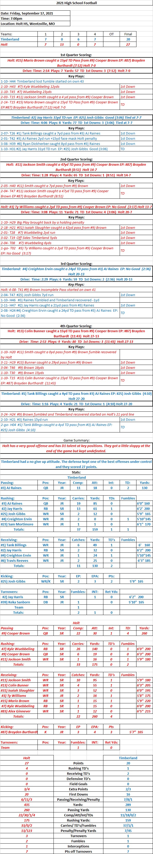 HSFB 09/17/21 Timberland (3-1) 20 at Holt (4-0) 27: Holt’s #9) Cooper Brown threw for 260 yards and 4 TDs Share this: Click to share on X (Opens in new window) X Click to share on Facebook (Opens in new window) Facebook Like Loading...