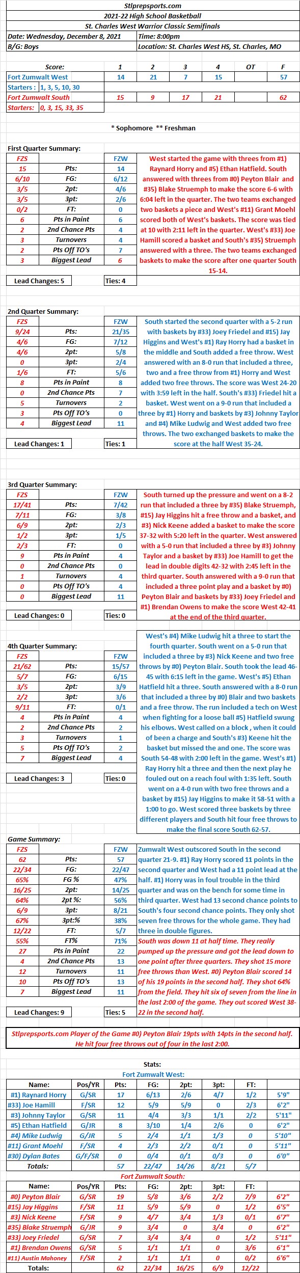 HSBB 12/8/21 HSBB SCW Warrior Classic Semifinal: Fort Zumwalt South 62 Fort Zumwalt West 57 Final: South overcame a 11 point deficit at halftime to get in the Championship against Marquette Share this: Click to share on X (Opens in new window) X Click to share on Facebook (Opens in new window) Facebook Like Loading...