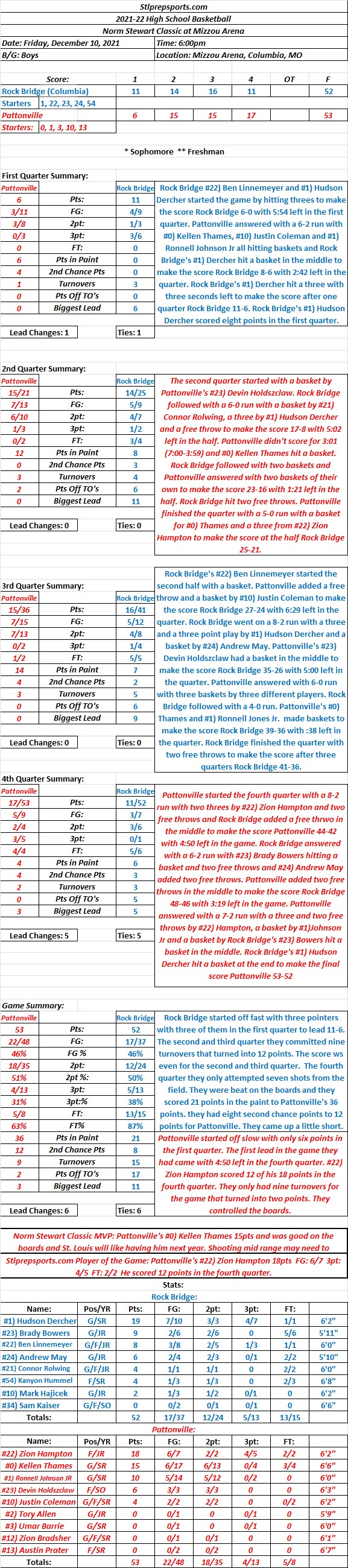 HSBB 12/10/21 Norm Stewart Classic at Mizzou Arena: Pattonville 53 Rock Bridge 52 Final: Pattonville’s #22) Zion Hampton scored 12 of his 18 points in the fourth quarter to get the win. Share this: Click to share on X (Opens in new window) X Click to share on Facebook (Opens in new window) Facebook Like Loading...
