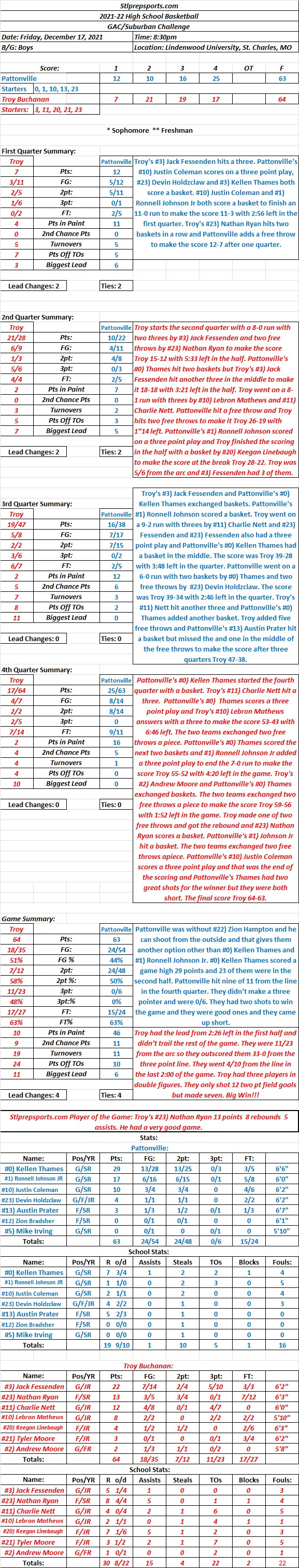 HSBB 12/17/21 GAC/Suburban Challenge at Lindenwood University: Troy Buchanan 64 Pattonville 63 Final: Pattonville’s #0) Kellen Thames scores 23 in the second half and it wasn’t enough. Troy gets a big win!!! Share this: Click to share on X (Opens in new window) X Click to share on Facebook (Opens in new window) Facebook Like Loading...