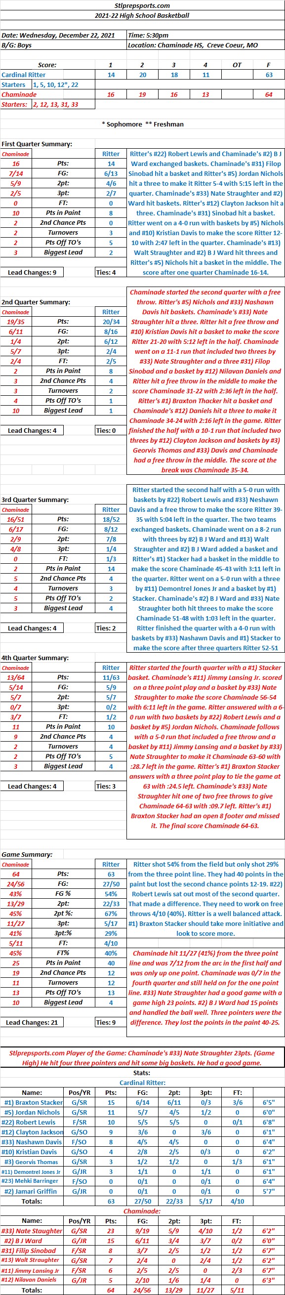 HSBB 12-22-21 Cardinal Ritter 63 at Chaminade 64 Final: Chaminade’s #33) Nate Straughter hits the game winning free throw with 9.7 seconds left and had a game high 23 points. Share this: Click to share on X (Opens in new window) X Click to share on Facebook (Opens in new window) Facebook Like Loading...