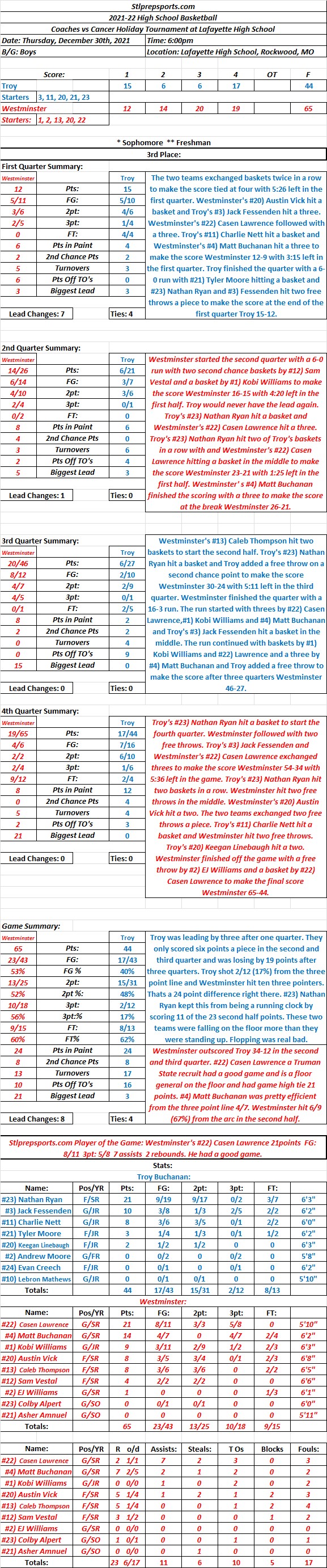 HSBB 12-30-21 Coaches vs Cancer Holiday Tournament at Lafayette High School 3rd Place: Westminster 65 Troy Buchanan 44 Final. Westminster took over in the second and third quarter to win by 21 points and take 3rd place. Share this: Click to share on X (Opens in new window) X Click to share on Facebook (Opens in new window) Facebook Like Loading...