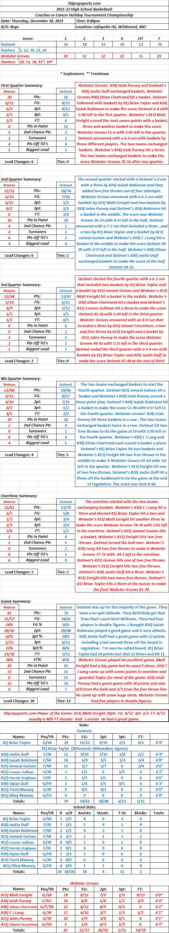 HSBB 12-30-21 Coaches vs Cancer Holiday Tournament Championship: Webster Groves 81 DeSmet 79 Final (OT) : This was a great game with 9 players in double figures. Share this: Click to share on X (Opens in new window) X Click to share on Facebook (Opens in new window) Facebook Like Loading...