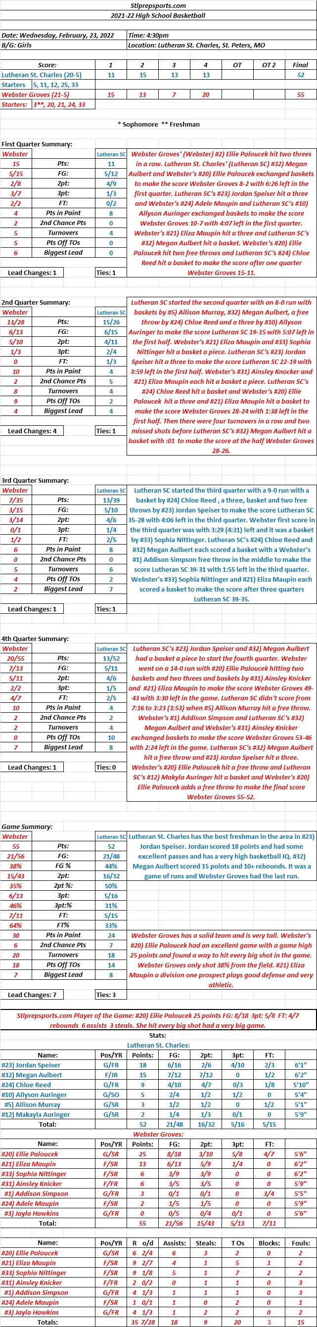 HSGB 02-23-22 Webster Groves 55 at Lutheran St. Charles 52 Final: Webster Groves’ #20) Ellie Paloucek scored a game high 25 points and kept Lutheran St. Charles from getting a Senior Night Win. Share this: Click to share on X (Opens in new window) X Click to share on Facebook (Opens in new window) Facebook Like Loading...