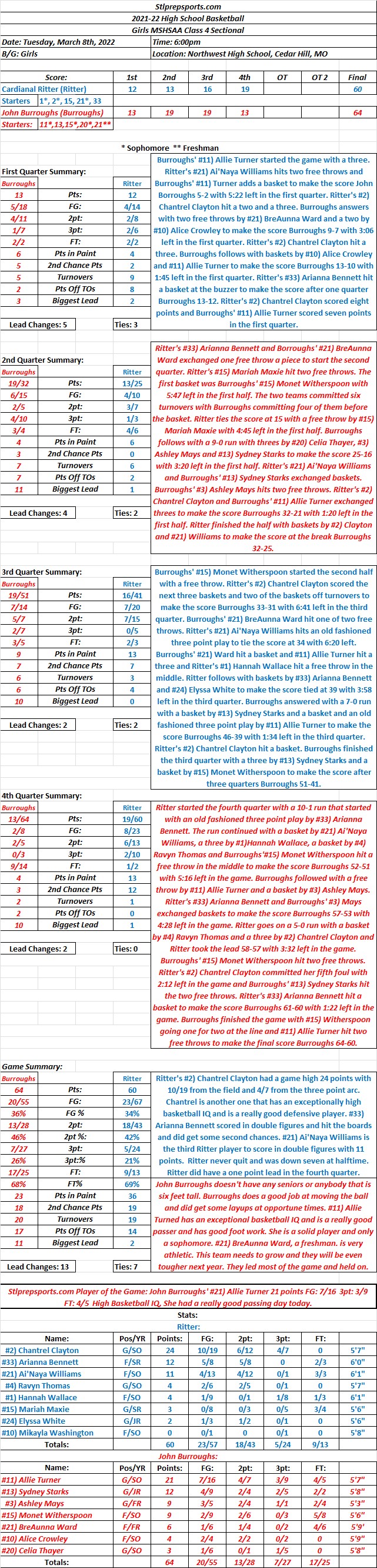 HSGB Girls MSHSAA Class 4 Sectional @ Northwest High School: John Burroughs 64 Cardinal Ritter 60 Final: Great Game!!! Two sophomore guards (Ritter’s #2- Chantrel Clayton and Burroughs’ #11- Allie Turner) going at it and Burroughs hangs on. Share this: Click to share on X (Opens in new window) X Click to share on Facebook (Opens in new window) Facebook Like Loading...