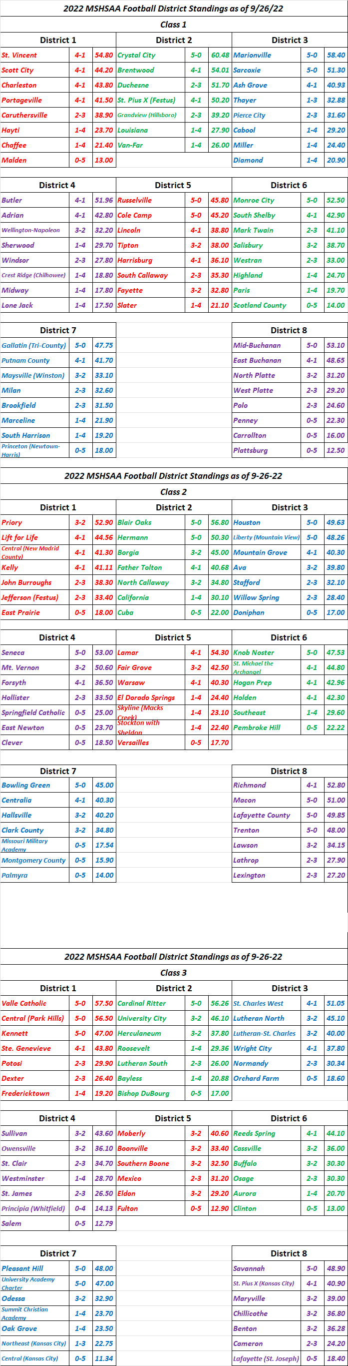 STLPREPSPORTS.COM MSHSAA Classes 1-3 District Standings as of 9-26-22 Share this: Click to share on X (Opens in new window) X Click to share on Facebook (Opens in new window) Facebook Like Loading...