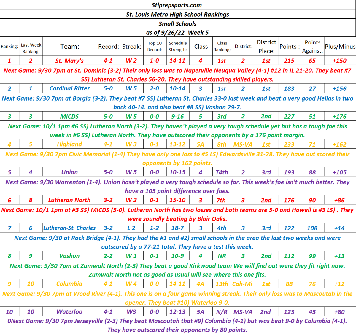 STLPREPSPORTS.COM St. Louis Metro Area High School Football Rankings as of 9/26/22 Week 5 Small Schools. Share this: Click to share on X (Opens in new window) X Click to share on Facebook (Opens in new window) Facebook Like Loading...
