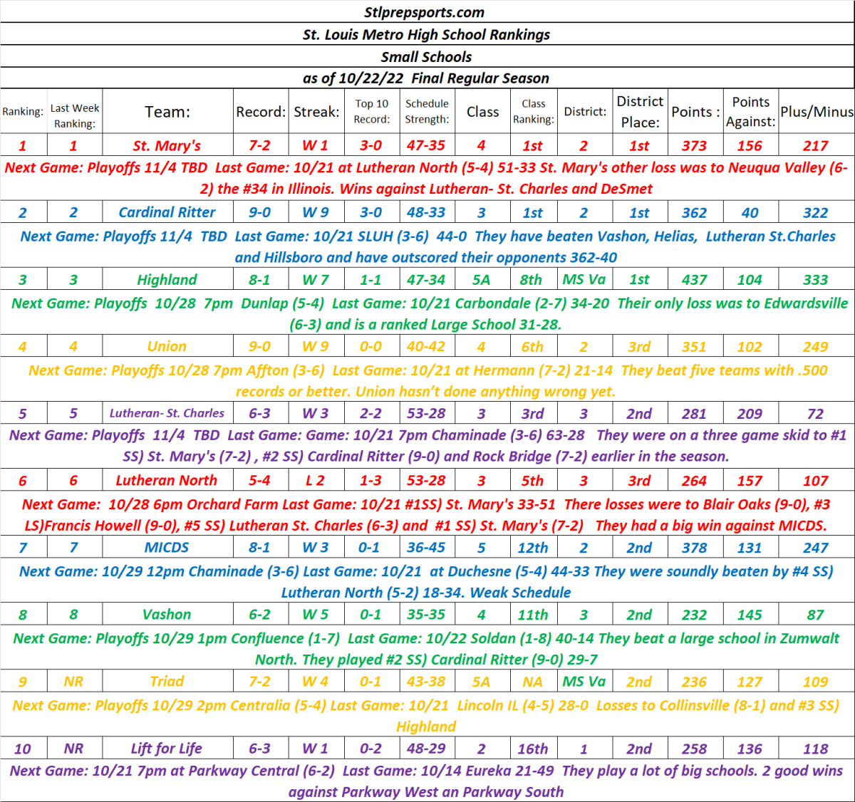 Stlprepsports.com St. Louis Metro Area High School Football Rankings Small Schools Final Regular Season Share this: Click to share on X (Opens in new window) X Click to share on Facebook (Opens in new window) Facebook Like Loading...
