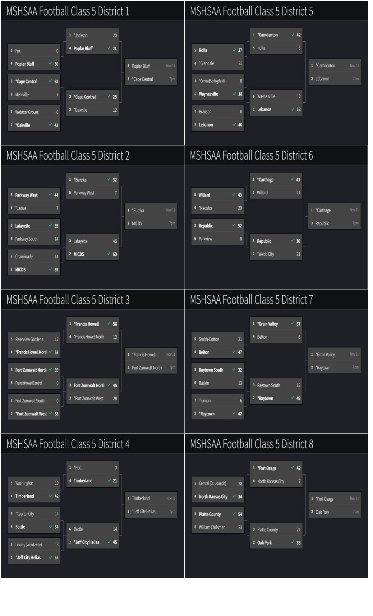 Stlprepsports.com MSHSAA Class 5 Football Districts 11/06/22 Share this: Click to share on X (Opens in new window) X Click to share on Facebook (Opens in new window) Facebook Like Loading...