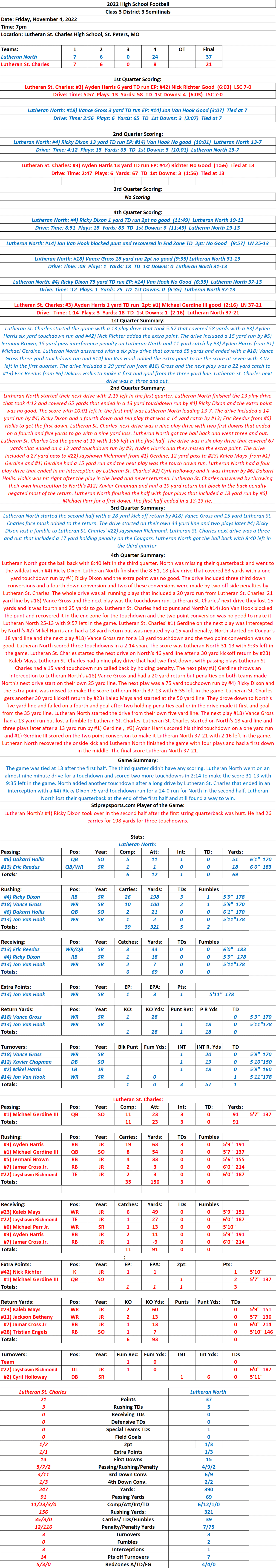 Stlprepsports.com MSHSAA Class 3 District 3 Semifinals: Lutheran North 37 at Lutheran St. Charles 21 Final: Lutheran North avenges regular season loss Share this: Click to share on X (Opens in new window) X Click to share on Facebook (Opens in new window) Facebook Like Loading...