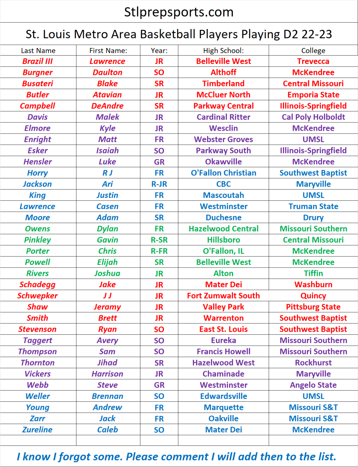 Stlprepsports.com St. Louis Area Basketball Players Playing D2 22-23 Share this: Click to share on X (Opens in new window) X Click to share on Facebook (Opens in new window) Facebook Like Loading...
