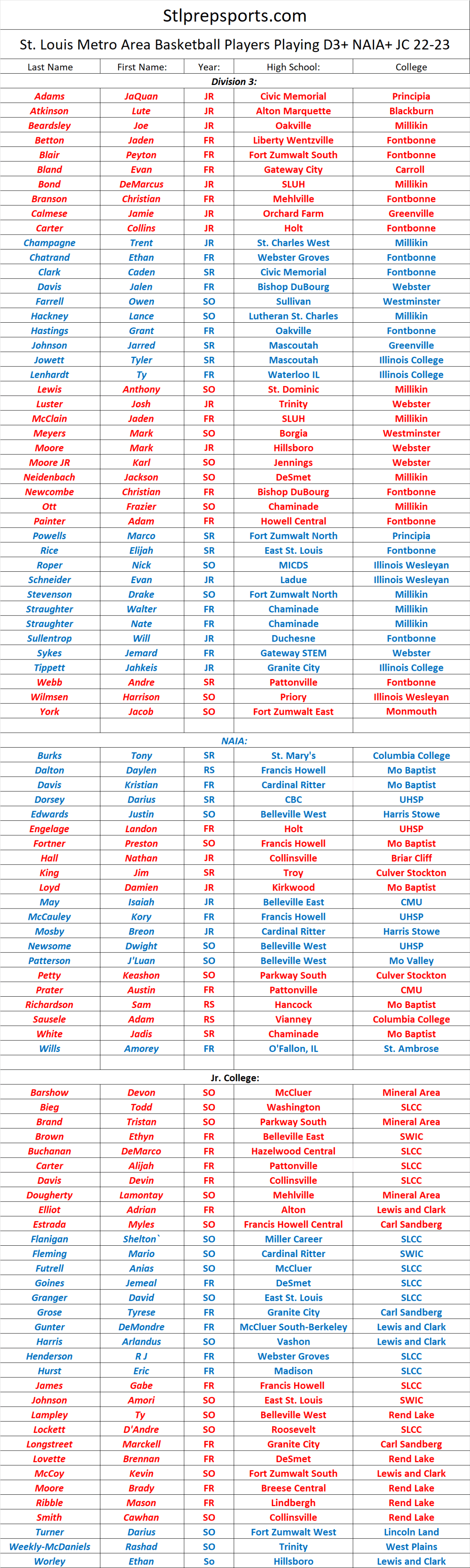 Stlprepsports.com St. Louis Area Basketball Players Playing D3, NAIA and Junior College 22-23 If I missed anybody and I did please comment and I will add them. Share this: Click to share on X (Opens in new window) X Click to share on Facebook (Opens in new window) Facebook Like Loading...