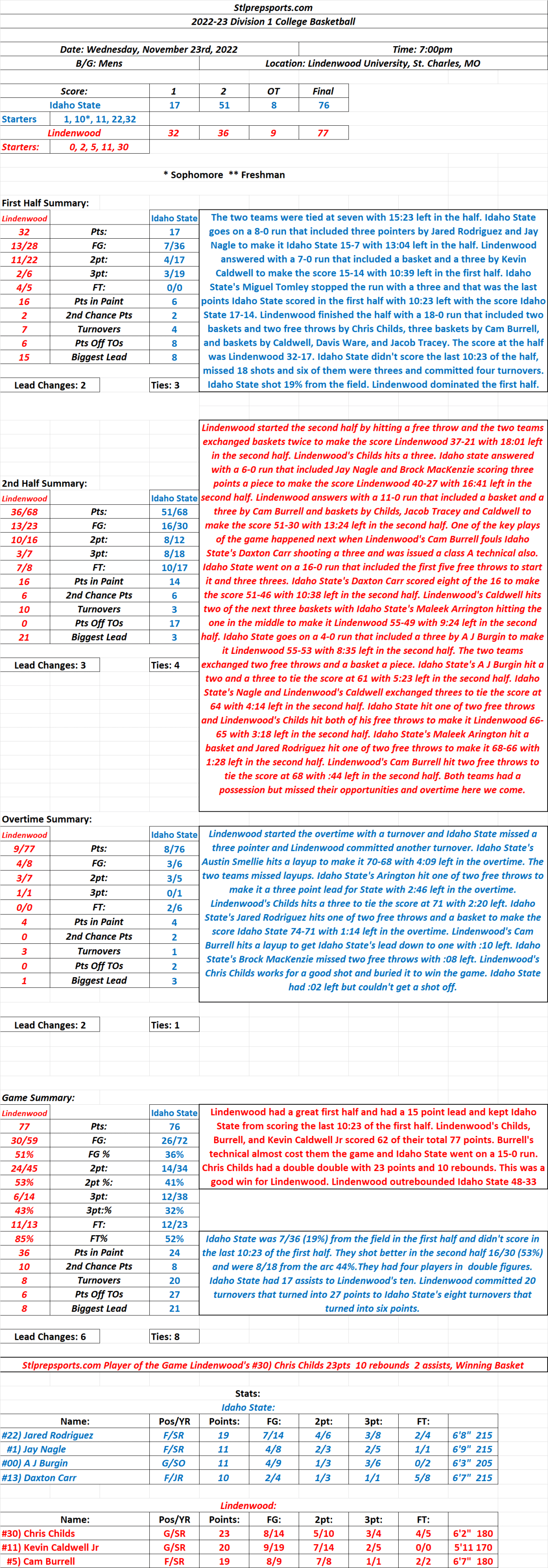 Stlprepsports.com Division 1 College Basketball: Idaho State 76 at Lindenwood 77 Final OT: Lindenwood’s Chris Childs hits the winner with :02 left in OT. Share this: Click to share on X (Opens in new window) X Click to share on Facebook (Opens in new window) Facebook Like Loading...