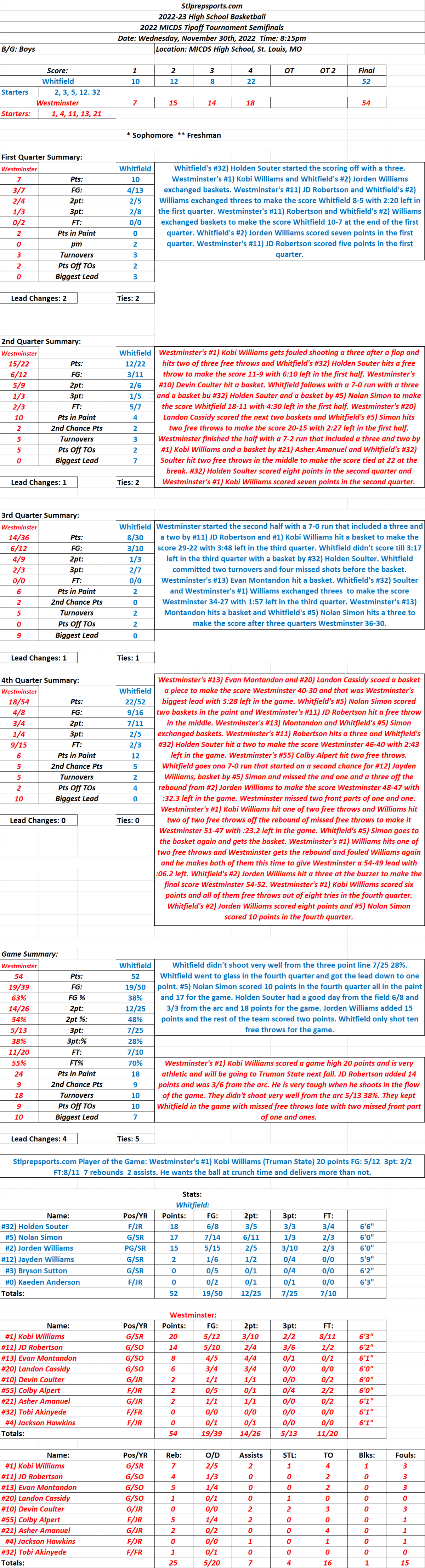 Stlprepsports.com MICDS Tipoff Semifinals: Westminster 54 Whitfield 52 Final: Westminster holds on after a Whitfield flourish at the end. Share this: Click to share on X (Opens in new window) X Click to share on Facebook (Opens in new window) Facebook Like Loading...