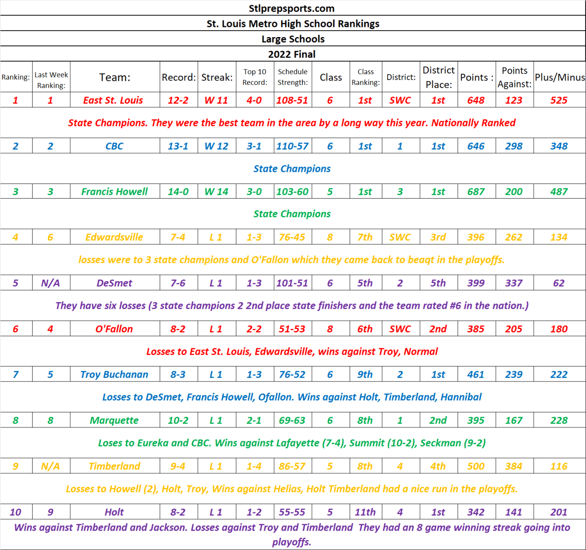 Stlprepsports.com: St. Louis Metro Area Football Large Schools 2022 Final Share this: Click to share on X (Opens in new window) X Click to share on Facebook (Opens in new window) Facebook Like Loading...