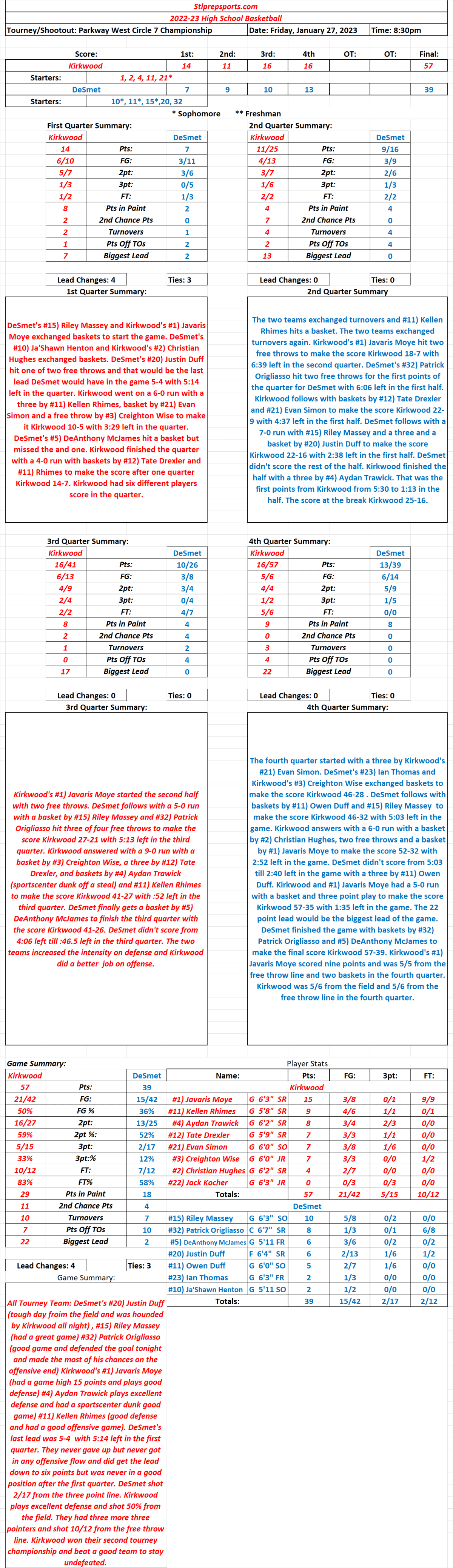 Stlprepsports.com: Circle 7 Ranch Showdown at Parkway West: Championship Kirkwood 57 DeSmet 39 Share this: Click to share on X (Opens in new window) X Click to share on Facebook (Opens in new window) Facebook Like Loading...