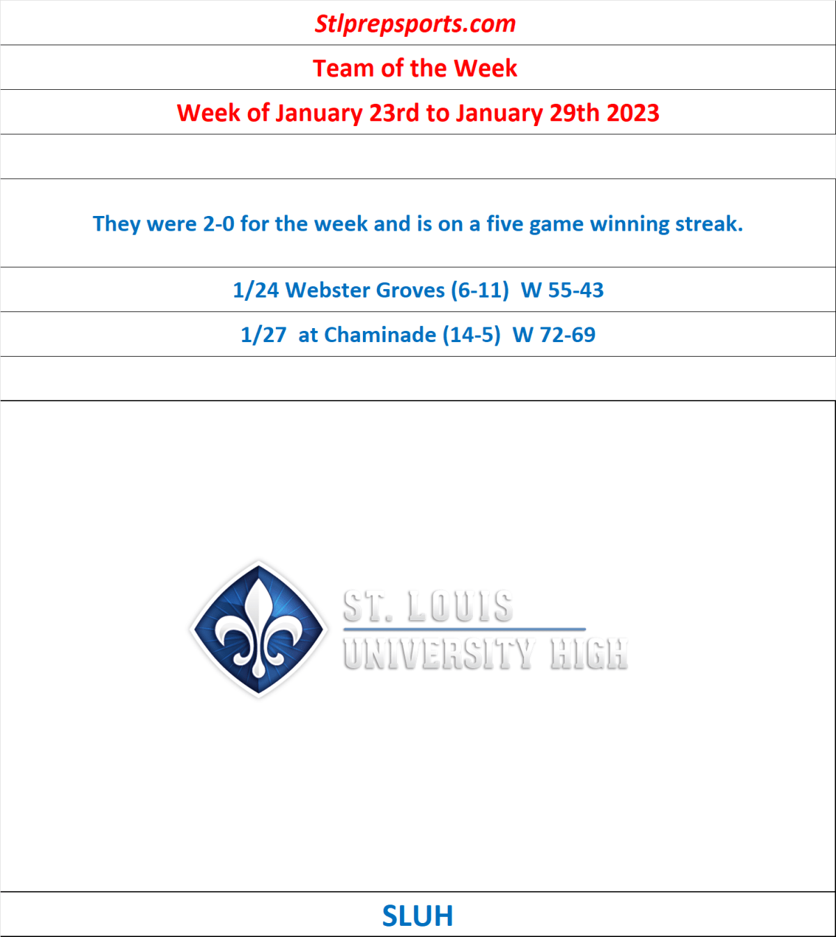 Stlprepsports.com: St. Louis Area High School Basketball Team of the Week of 01/23 to 01/29/2023 Share this: Click to share on X (Opens in new window) X Click to share on Facebook (Opens in new window) Facebook Like Loading...