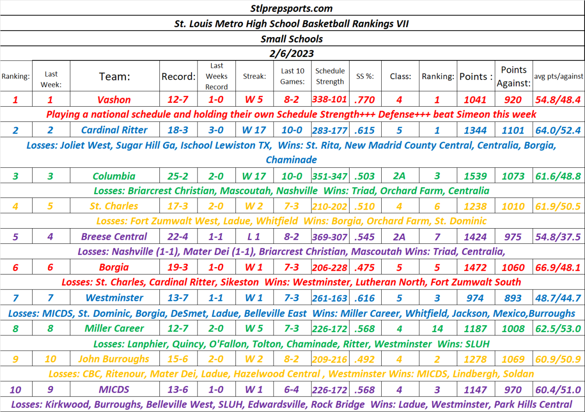 Stlprepsports.com Small Schools St. Louis Metro Area High School Basketball Rankings 02/06/2023 Share this: Click to share on X (Opens in new window) X Click to share on Facebook (Opens in new window) Facebook Like Loading...