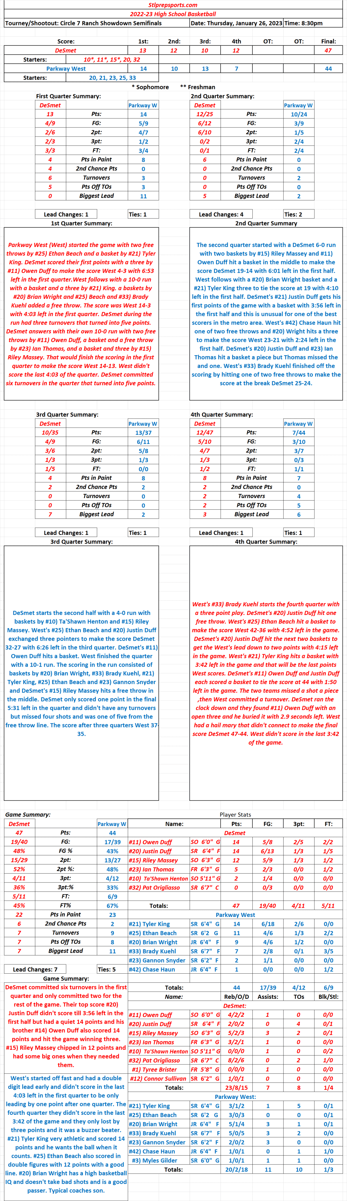 Stlprepsports.com: Circle 7 Ranch Showdown at Parkway West Semifinals: 1/26/23 DeSmet 47 at Parkway West 44 Final: DeSmet’s #11) Owen Duff hits a three with 2.9 seconds left. Share this: Click to share on X (Opens in new window) X Click to share on Facebook (Opens in new window) Facebook Like Loading...