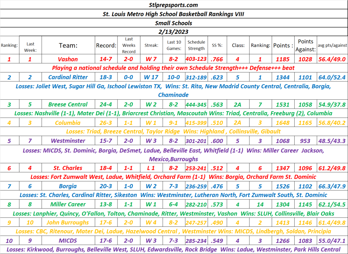 Stlprepsports.com Small Schools St. Louis Metro Area High School Basketball Rankings 02/12/2023 Share this: Click to share on X (Opens in new window) X Click to share on Facebook (Opens in new window) Facebook Like Loading...