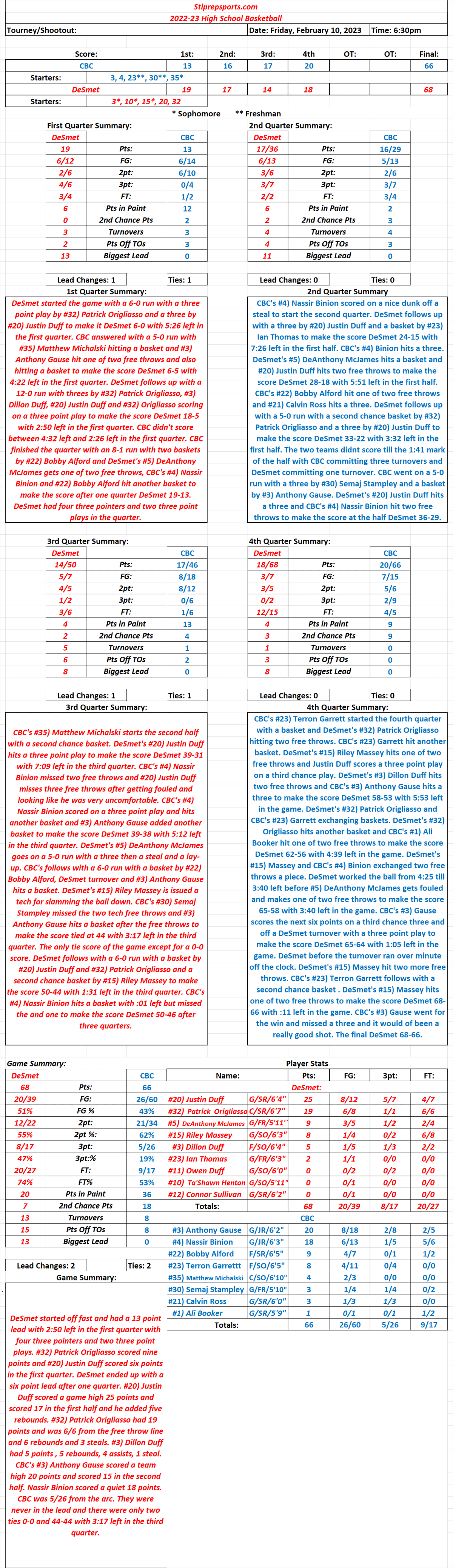 Stlprepsports.com: 2/10/23 CBC 66 at DeSmet 68 Final: DeSmet gets at least a tie for the MCC Conference Title Share this: Click to share on X (Opens in new window) X Click to share on Facebook (Opens in new window) Facebook Like Loading...