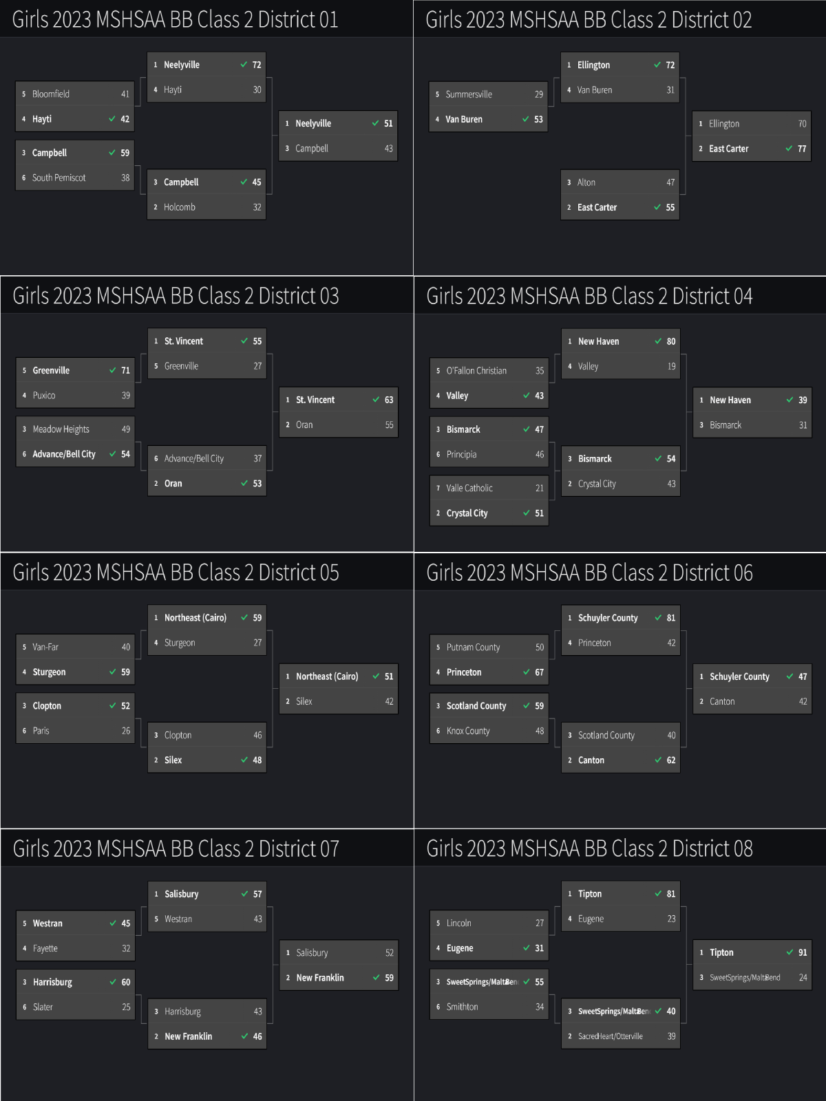 Stlprepsports.com 2022-23 MSHSAA Girls Basketball Class 2 Districts 1-8 Final Share this: Click to share on X (Opens in new window) X Click to share on Facebook (Opens in new window) Facebook Like Loading...