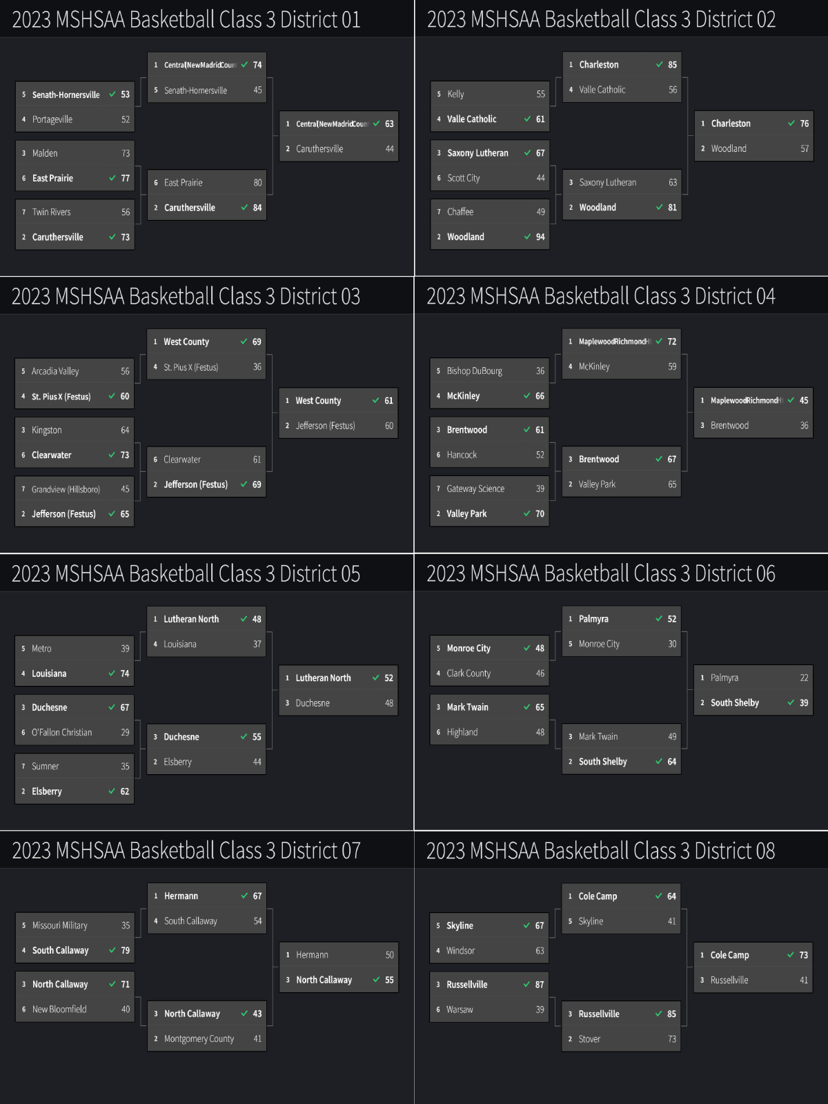Stlprepsports.com 2022-23 MSHSAA Boys Basketball Class 3 Districts 1-8 Final Share this: Click to share on X (Opens in new window) X Click to share on Facebook (Opens in new window) Facebook Like Loading...