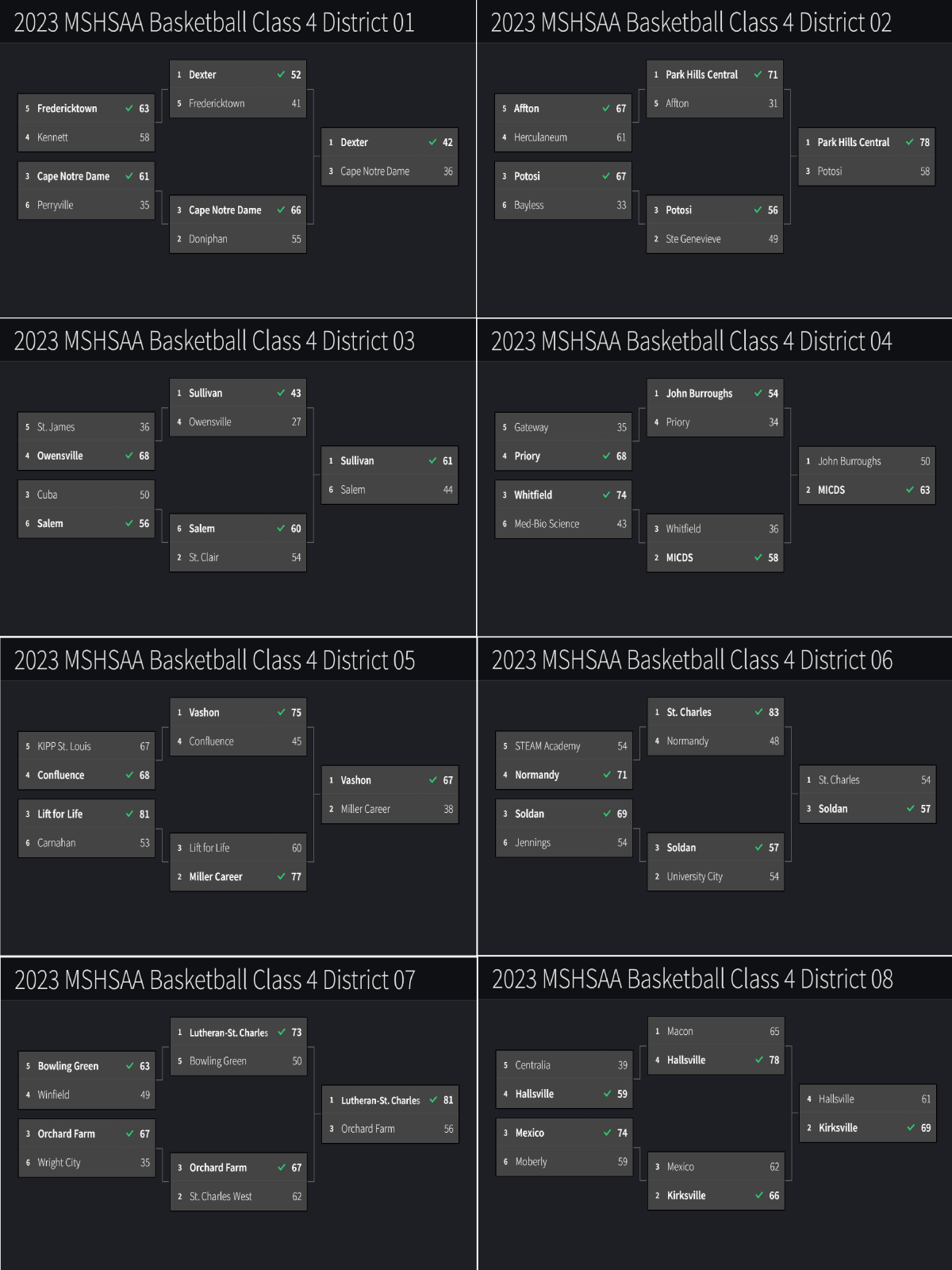 Stlprepsports.com 2022-23 MSHSAA Boys Basketball Class 4 Districts 1-8 Final Share this: Click to share on X (Opens in new window) X Click to share on Facebook (Opens in new window) Facebook Like Loading...