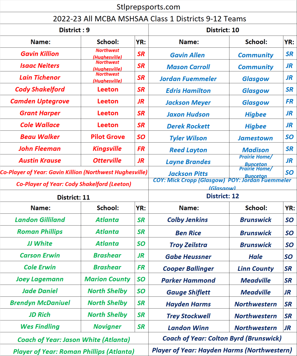 Stlprepsports.com 2022-23 All MCBA MSHSAA Class 1 Districts 9-12 Teams Share this: Click to share on X (Opens in new window) X Click to share on Facebook (Opens in new window) Facebook Like Loading...