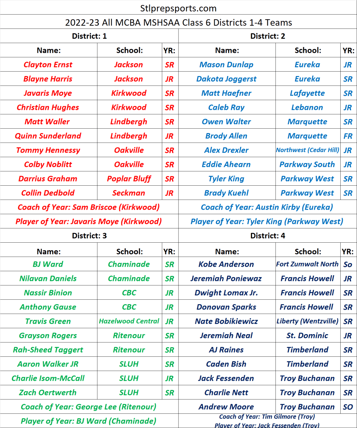 Stlprepsports.com 2022-23 All MBCA MSHSAA District Teams 1-4 Share this: Click to share on X (Opens in new window) X Click to share on Facebook (Opens in new window) Facebook Like Loading...