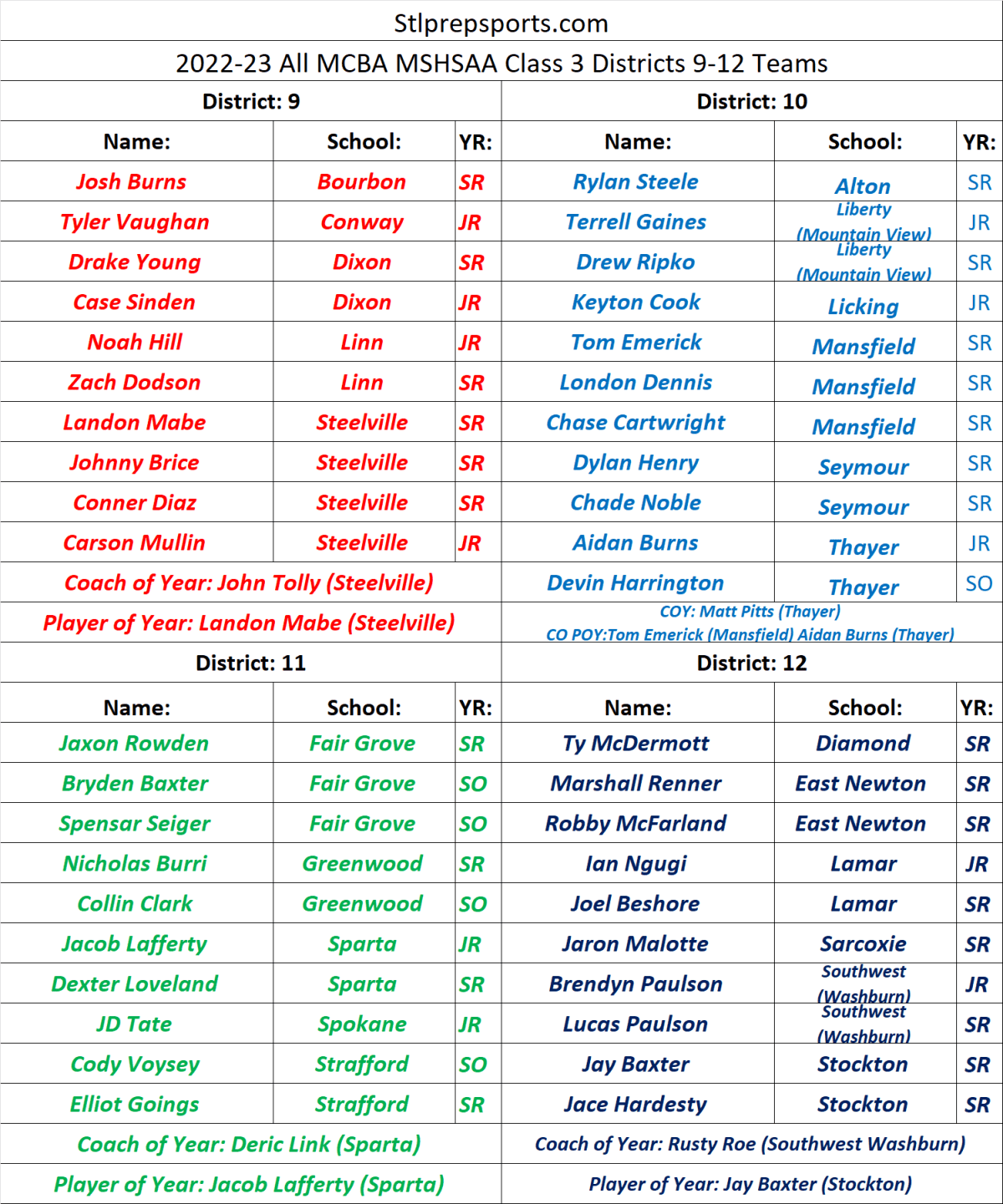 Stlprepsports.com 2022-23 All MCBA MSHSAA Class 3 Districts 9-12 Teams Share this: Click to share on X (Opens in new window) X Click to share on Facebook (Opens in new window) Facebook Like Loading...