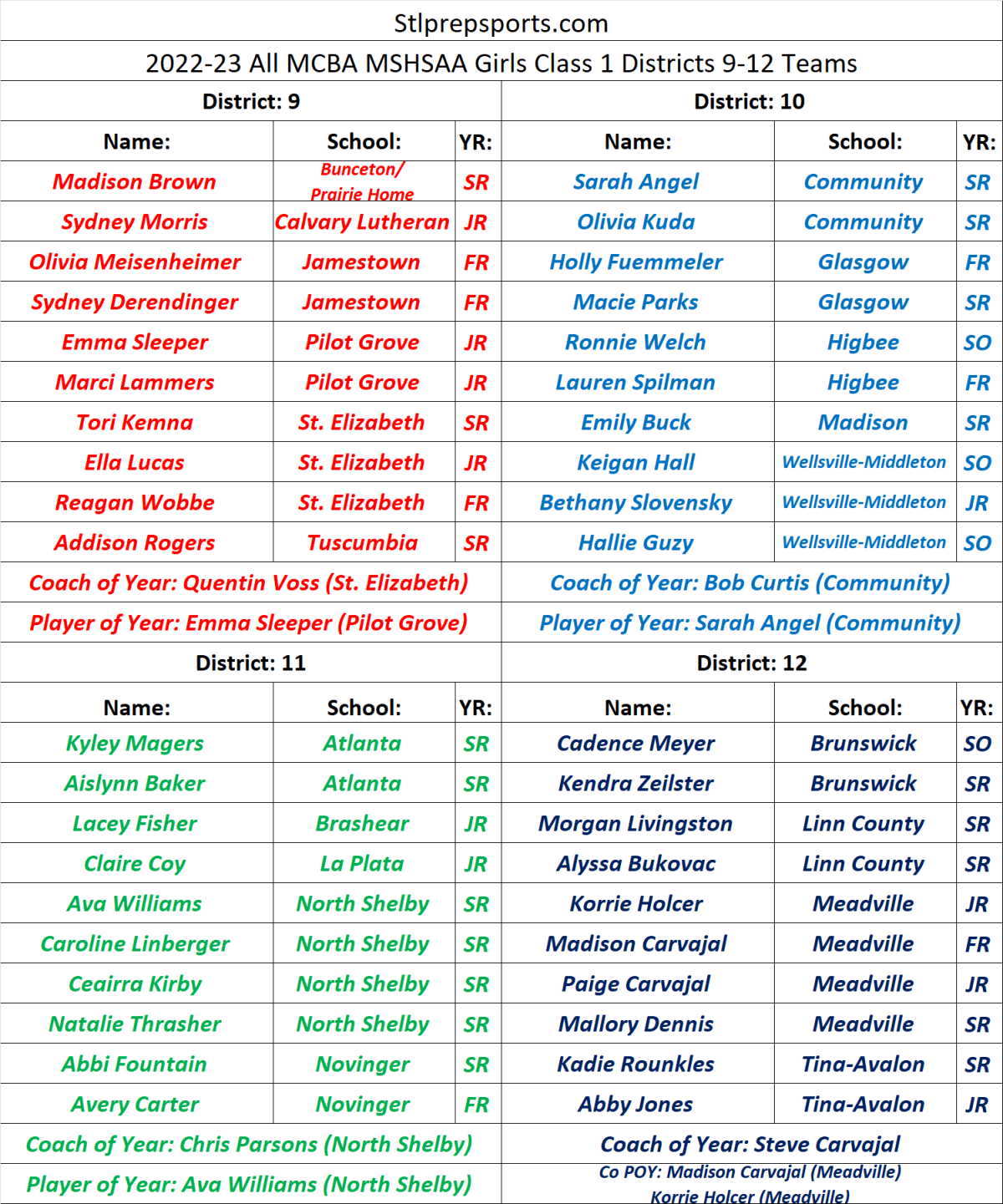 Stlprepsports.com 2022-23 All MCBA MSHSAA Girls Class 1 Districts 9-12 Teams Share this: Click to share on X (Opens in new window) X Click to share on Facebook (Opens in new window) Facebook Like Loading...
