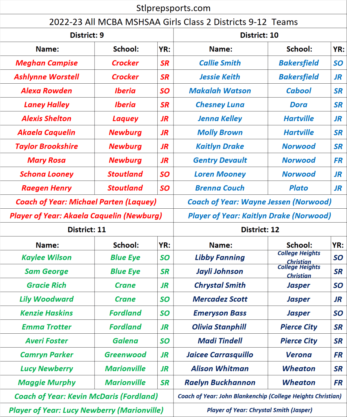 Stlprepsports.com 2022-23 All MCBA MSHSAA Girls Class 2 Districts 9-12 Teams Share this: Click to share on X (Opens in new window) X Click to share on Facebook (Opens in new window) Facebook Like Loading...