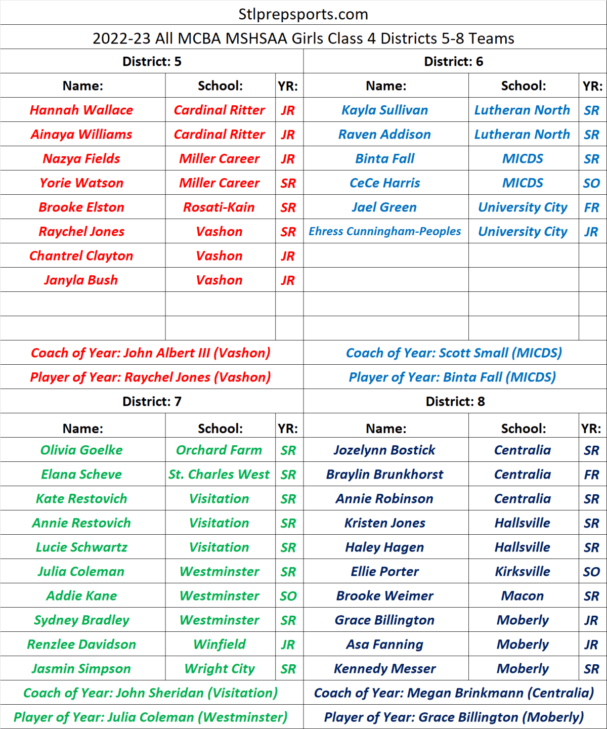 Stlprepsports.com 2022-23 All MCBA MSHSAA Girls Class 4 Districts 5-8 Teams Share this: Click to share on X (Opens in new window) X Click to share on Facebook (Opens in new window) Facebook Like Loading...