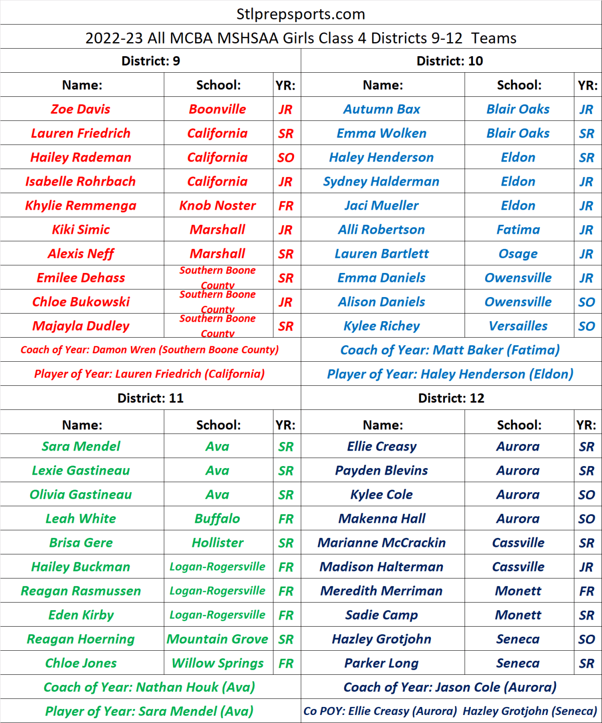 Stlprepsports.com 2022-23 All MCBA MSHSAA Girls Class 4 Districts 9-12 Teams Share this: Click to share on X (Opens in new window) X Click to share on Facebook (Opens in new window) Facebook Like Loading...