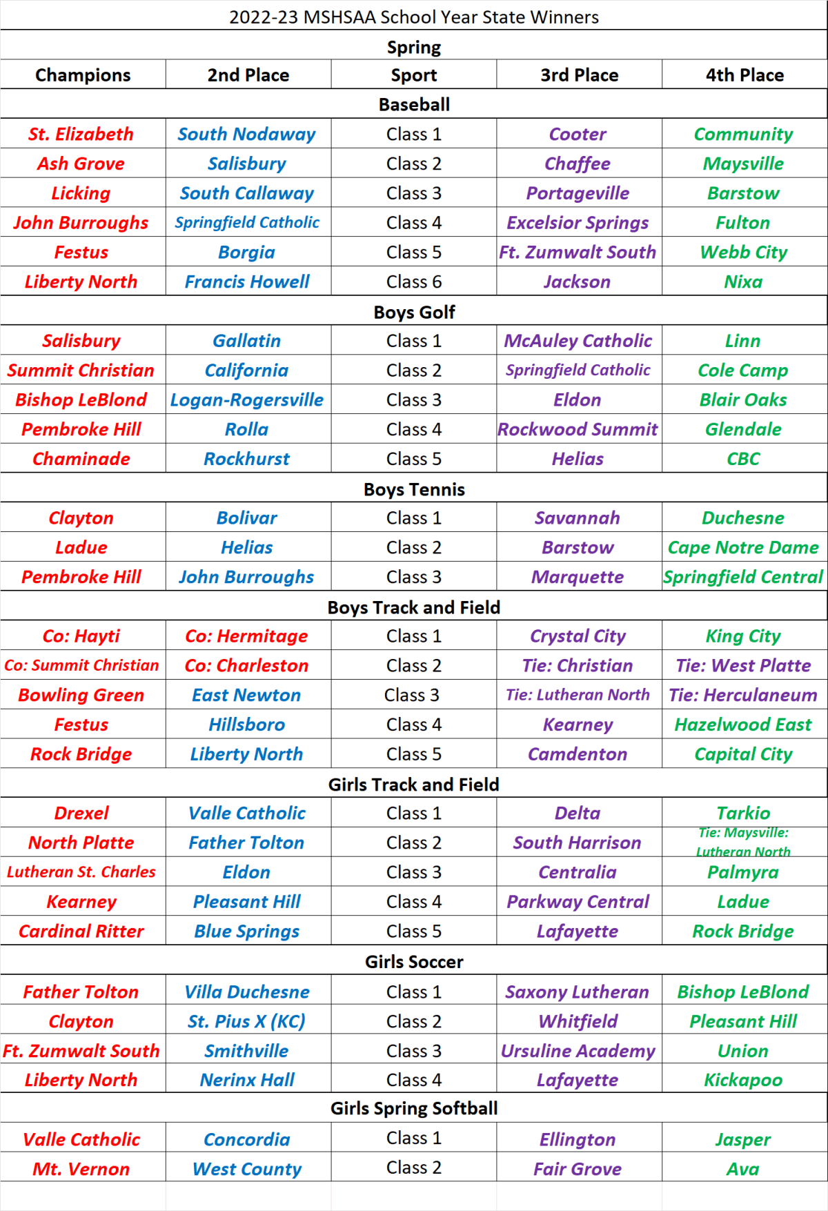 Stlprepsports.com 2022-23 School Year Spring MSHSAA State Champions Share this: Click to share on X (Opens in new window) X Click to share on Facebook (Opens in new window) Facebook Like Loading...