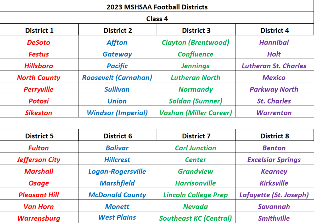 Stlprepsports.com 2023 MSHSAA Football Districts Class 4 Share this: Click to share on X (Opens in new window) X Click to share on Facebook (Opens in new window) Facebook Like Loading...